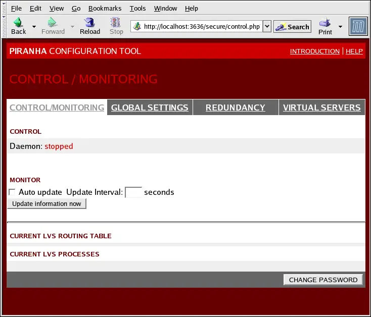 The CONTROL/MONITORING Panel displays runtime status. It displays the status of the pulse daemon, the LVS routing table, and the LVS-spawned nanny processes.