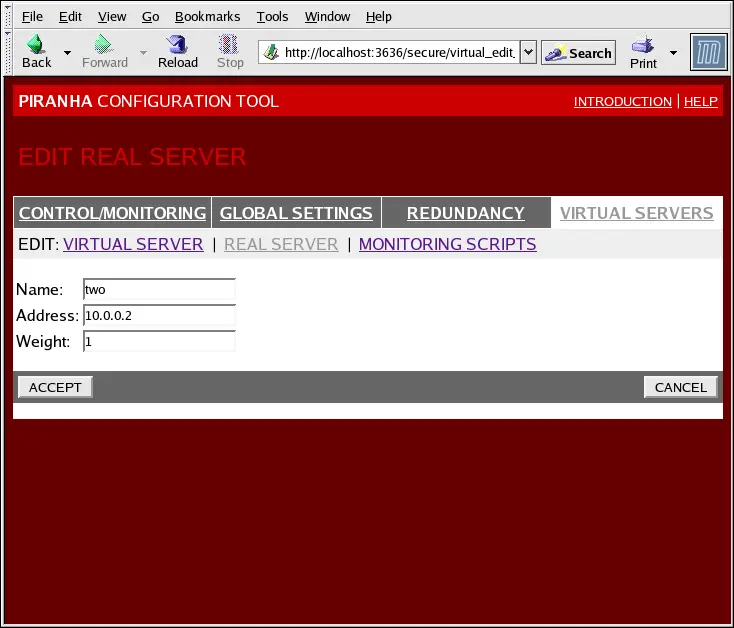 Click the ADD button to add a new server. To delete an existing server, select the radio button beside it and click the DELETE button. Click the EDIT button to load the EDIT REAL SERVER panel, as seen in Figure 1.36, “The REAL SERVER Configuration Panel”.
