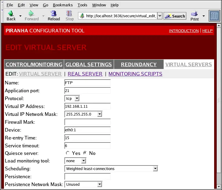 Click on the MONITORING SCRIPTS link at the top of the page. The EDIT MONITORING SCRIPTS subsection allows the administrator to specify a send/expect string sequence to verify that the service for the virtual server is functional on each real server. It is also the place where the administrator can specify customized scripts to check services requiring dynamically changing data.
