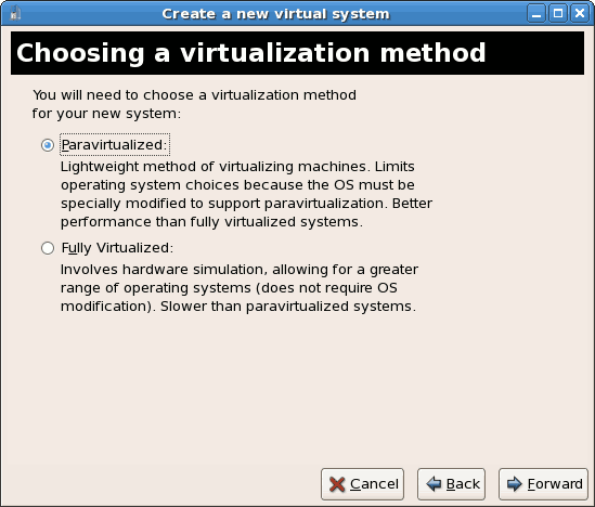 Full virtualization requires a system with Intel® VT or AMD-V processor. If the virtualization extensions are not present the