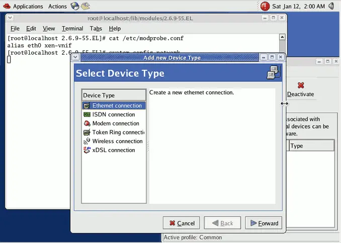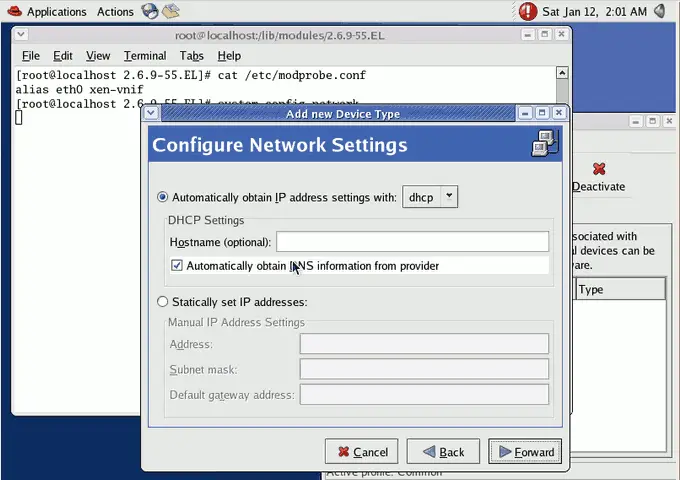 4. Start the network configuration utility(NetworkManager) with the command “# system-config-network”. Click on the “ Forward ” button to start the network card configuration.