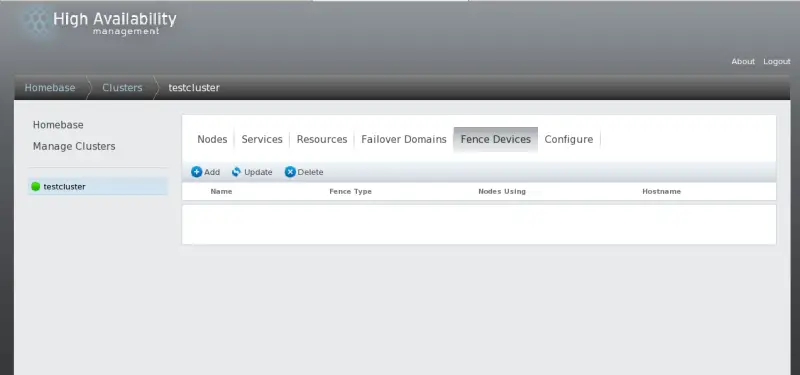Creating a fence device consists of selecting a fence device type and entering parameters for that fence device (for example, name, IP address, login, and password). Updating a fence device consists of selecting an existing fence device and changing parameters for that fence device. Deleting a fence device consists of selecting an existing fence device and deleting it.