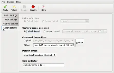 The Expert Settings tab enables you to choose which kernel and initial RAM disk to use, as well as to customize the options that are passed to the kernel and the core collector program.