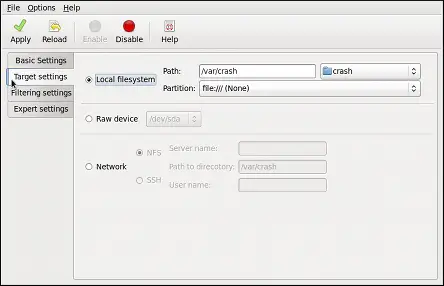 The Target Settings tab enables you to specify the target location for the vmcore dump. It can be either stored as a file in a local file system, written directly to a device, or sent over a network using the NFS (Network File System) or SSH (Secure Shell) protocol.