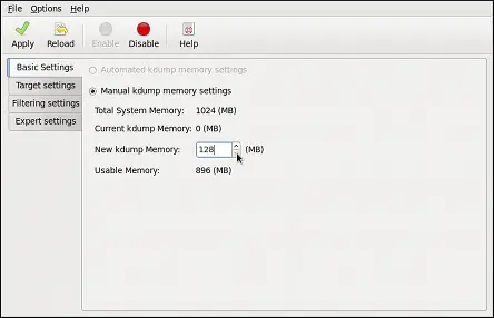 The Basic Settings tab enables you to configure the amount of memory that is reserved for the kdump kernel. To do so, select the Manual kdump memory settings radio button, and click the up and down arrow buttons next to the New kdump Memory field to increase or decrease the value. Notice that the Usable Memory field changes accordingly showing you the remaining memory that will be available to the system.
