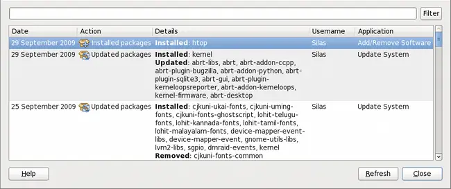Typing the name of a package in the top text entry field filters the list of transactions to those which affected that package.