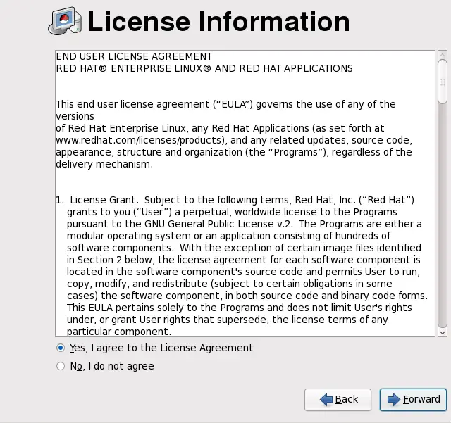 This screen displays the overall licensing terms for Red Hat Enterprise Linux.