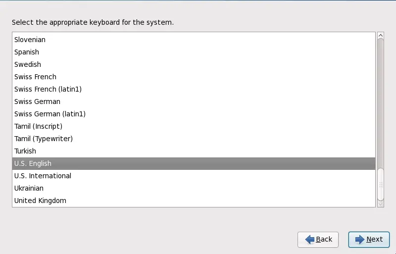 Using your mouse, select the correct layout type (for example, U.S. English) for the keyboard you would prefer to use for the installation and as the system default (refer to the figure below).