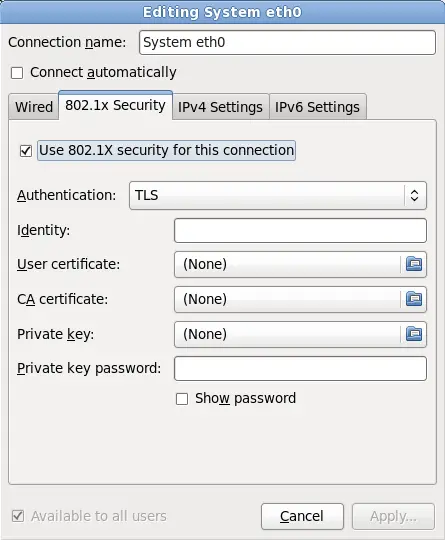 Use the 802.1x Security tab to configure 802.1X port-based network access control (PNAC). Select Use 802.1X security for this connection to enable access control, then specify details of your network. The configuration options include: