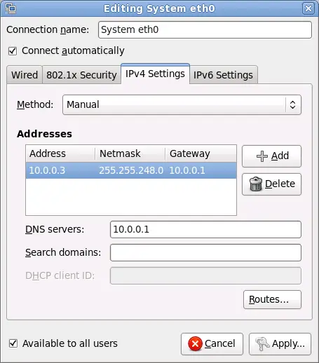 If you selected a a method that requires you to supply manual parameters, enter details of the IP address for this interface, the netmask, and the gateway in the Addresses field. Use the Add and Delete buttons to add or remove addresses. Enter a comma-separated list of DNS servers in the DNS servers field, and a comma-separated list of domains in the Search domains field for any domains that you want to include in name server lookups.