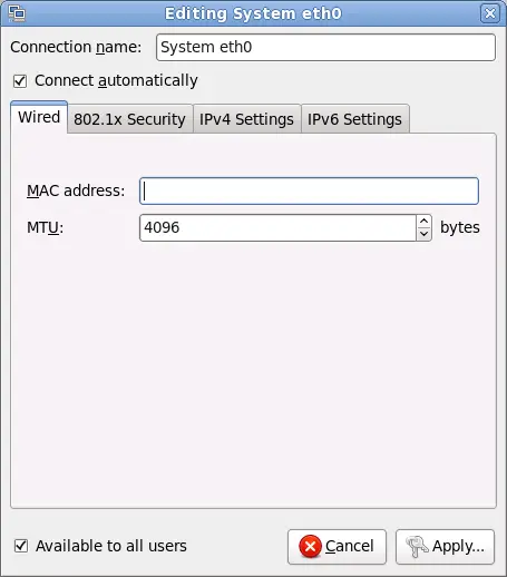 Use the Wired tab to specify or change the media access control (MAC) address for the network adapter, and either set the maximum transmission unit (MTU, in bytes) that can pass through the interface.