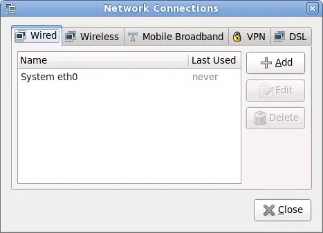 All network connections on System z are listed in the Wired tab. By default this contains the connection configured earlier in installation phase 1 and is either eth0 (OSA, LCS), or hsi0 (HiperSockets). Note that on System z you cannot add a new connection here. To modify an existing connection, select a row in the list and click the Edit button. A dialog box appears with a set of tabs appropriate to wired connections, as described below.