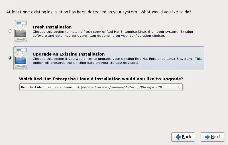 If your system contains a Red Hat Enterprise Linux installation, a dialog appears asking whether you want to upgrade that installation. To perform an upgrade of an existing system, choose the appropriate installation from the drop-down list and select Next.