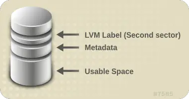 Figure 2.1, “Physical Volume layout” shows the layout of an LVM physical volume. The LVM label is on the second sector, followed by the metadata area, followed by the usable space on the device.