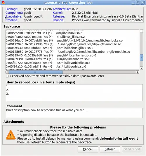 Red Hat Enterprise Linux 6 features the new Automated Bug Reporting Tool (ABRT). ABRT logs details of software crashes on a local system, and provides interfaces (both graphical and command line based) to report issues to Red Hat support.
