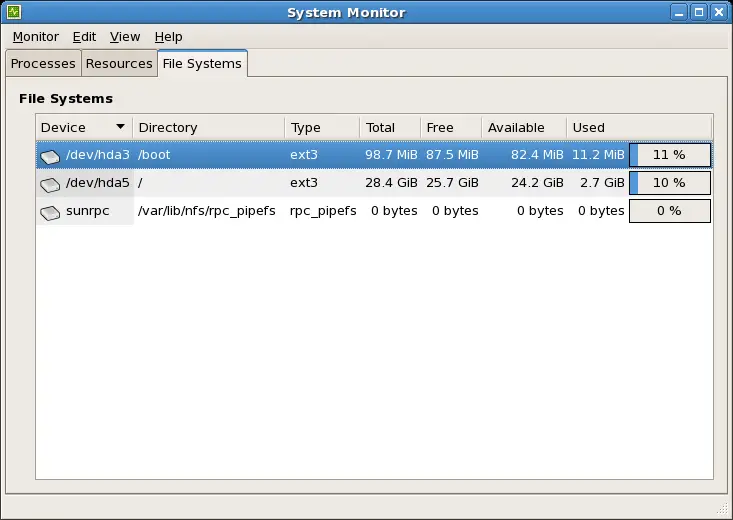 To view the system's partitions and disk space usage in a graphical format, use the Gnome System Monitor by clicking on > > or using the command gnome-system-monitor. Select the File Systems tab to view the system's partitions. The figure below illustrates the File Systems tab.
