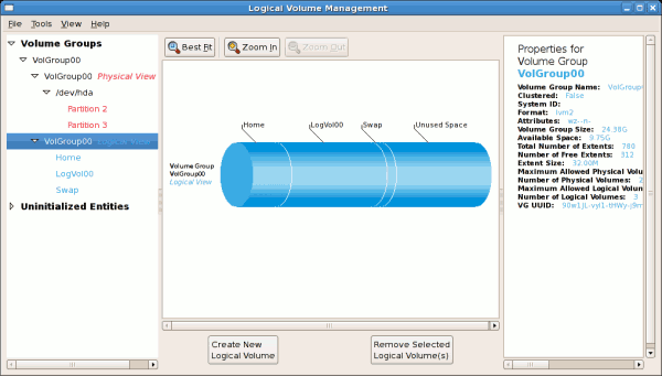 select an existing logical volume and remove it from the volume group by clicking on the Remove Selected Logical Volume(s) button. Please note that you cannot select unused space to perform this operation.