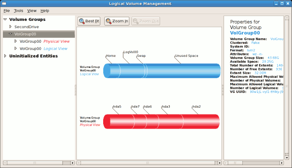 In the figure below, the uninitialized entities (partitions 3, 5, 6 and 7) were added to 'VolGroup00'.