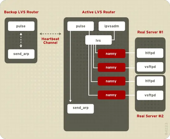The pulse daemon runs on both the active and passive LVS routers. On the backup router, pulse sends a heartbeat to the public interface of the active router to make sure the active router is still properly functioning. On the active router, pulse starts the lvs daemon and responds to heartbeat queries from the backup LVS router.