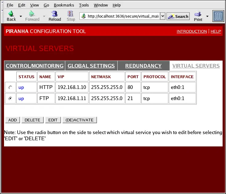 To enable or disable a virtual server in the table click its radio button and click the (DE)ACTIVATE button.