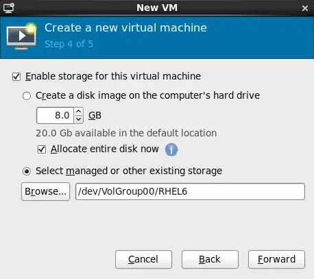 Enable and assign storage for the Red Hat Enterprise Linux 6 guest. Assign at least 5GB for a desktop installation or at least 1GB for a minimal installation.