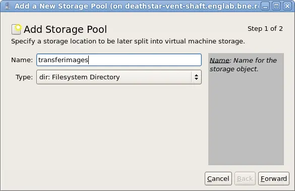 virt-v2v copies the guest storage to a locally defined libvirt storage pool during import. This pool can be defined using any libvirt tool, and can be of any type. The simplest way to create a new pool is with virt-manager. Select your host, right click and select details.