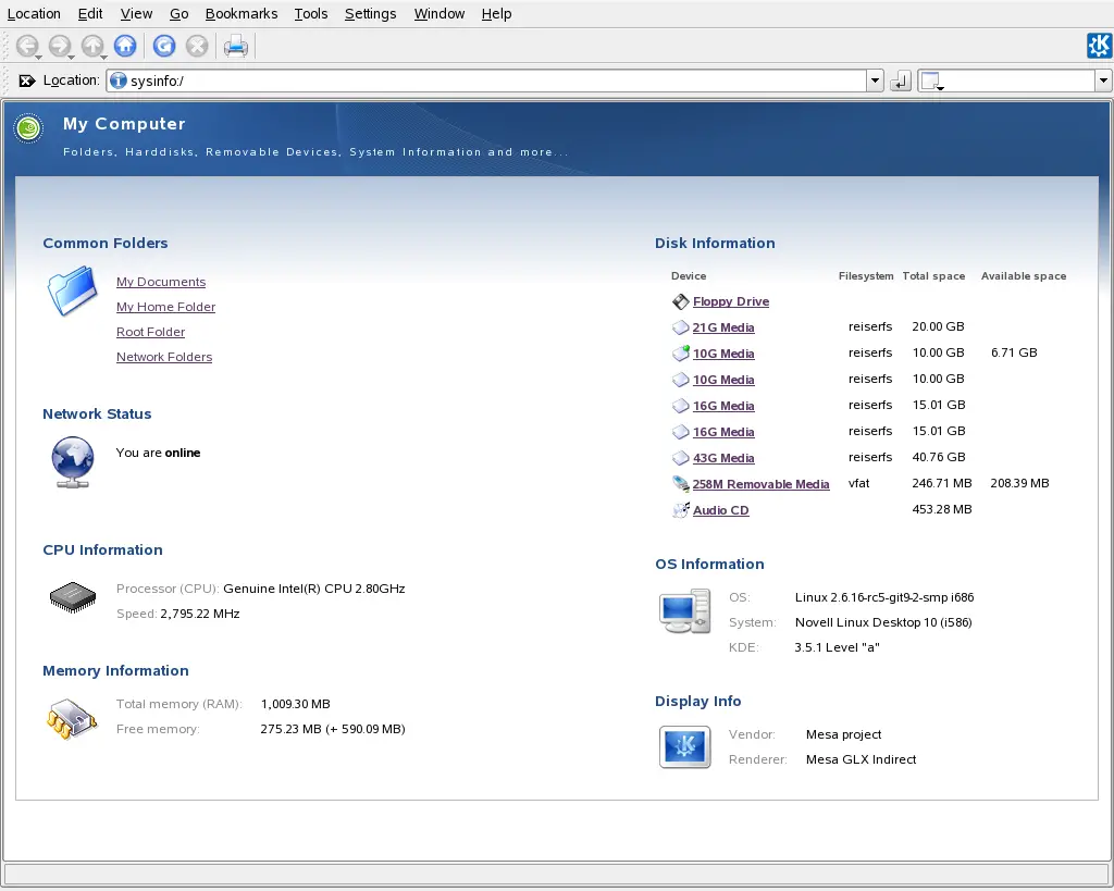 Displays information about hardware, network status,