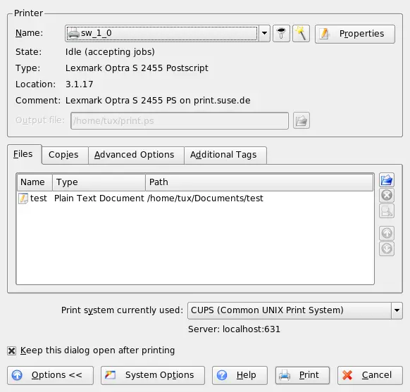 KDE application. In the KPrinter dialog, choose a printer and edit