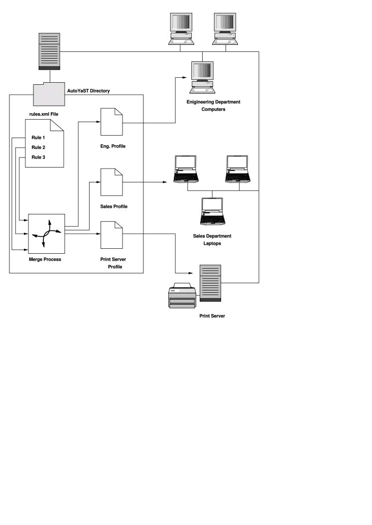 following example, depicted in Figure 5-2. One run of AutoYaST installs the