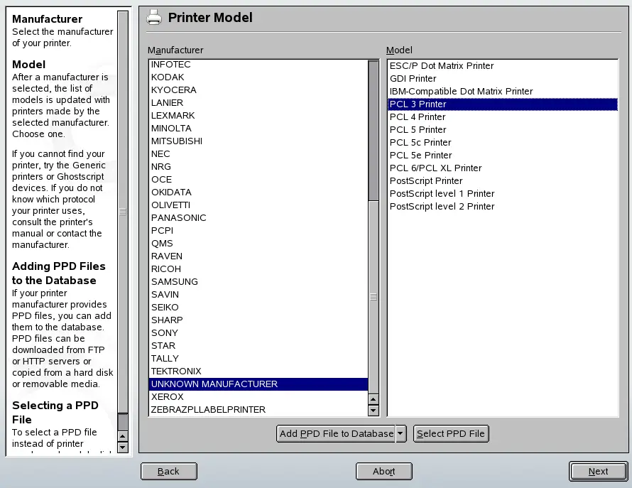 manufacturer and a model in the next dialog (), YaST selects the PPD file that corresponds to the