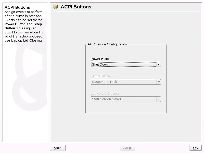 Access the dialog for configuring the ACPI buttons using . It is shown in Figure 29-5.