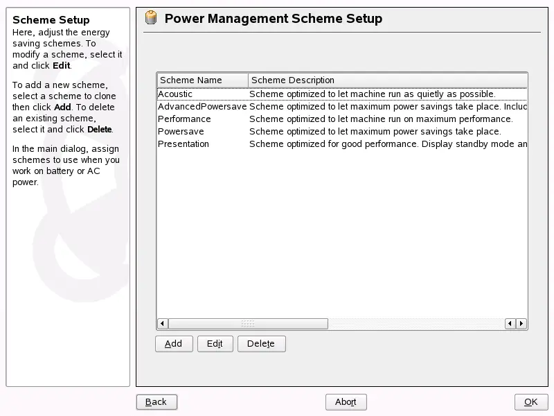 operation. To add or modify the schemes, click , which opens an overview of the existing schemes like that