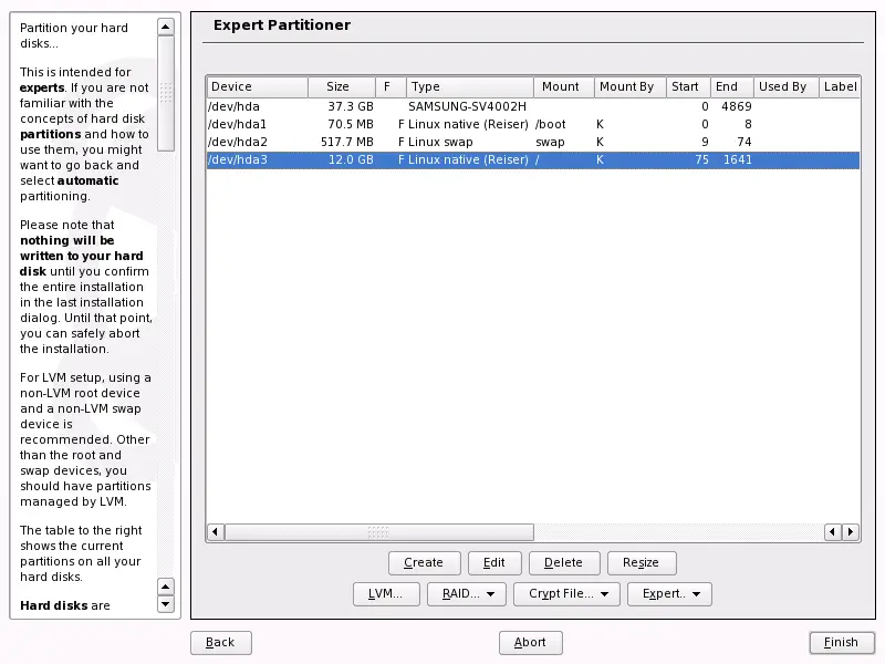 can be added, deleted, resized, and edited. Also access the soft RAID, EVMS, and LVM configuration from this YaST module.